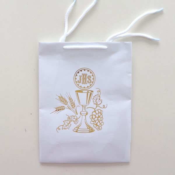 Torba foliowana prezentowa formatu A5 z motywem komunijnym. Cena dotyczy 1 sztuki. Zdjęcie przedstawia przykładowe wzory toreb.
