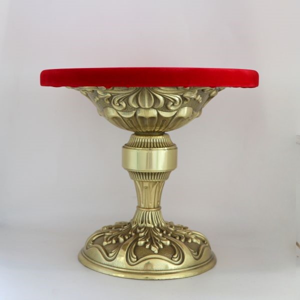 Tron wykonany z mosiądzu z welurem. Wysokość: 21,5cm Średnica górna: 24 cm