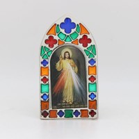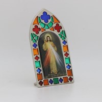 Dekoracyjny witraż z obrazem Jezusa Miłosiernego. Możliwość postawienia (stopki w dolnej części).
