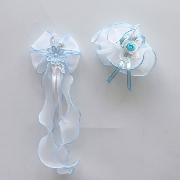 Bardzo ozdobna wstążka/stroik dekoracyjna z tiulu w kolorze niebieskim.